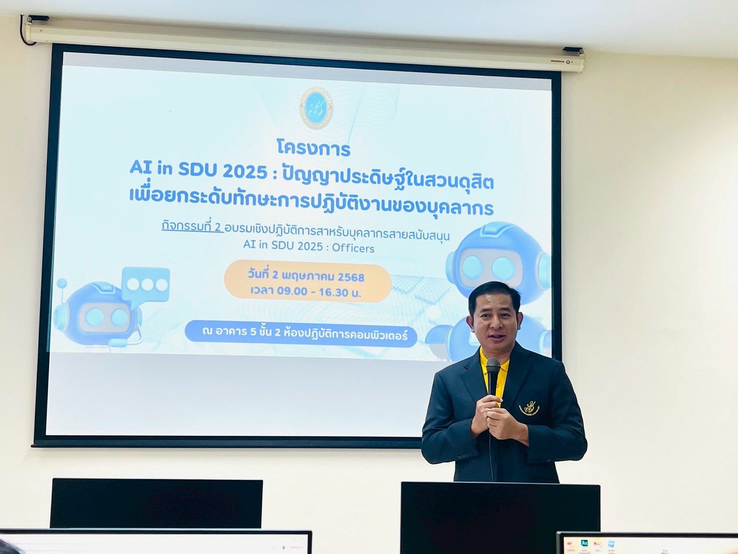 ปัญญาประดิษฐ์ในสวนดุสิต เพื่อยกระดับทักษะการปฏิบัติงาน ของบุคลากร เพื่อยกระดับความรู้ และพัฒนาทักษะดิจิทัลสมัยใหม่ ในกิจกรรมที่ 2 ; อบรมเชิงปฏิบัติการสำหรับบุคากรสายสนับสนุน ของมหาวิทยาลัยสวนดุสิต ศูนย์การศึกษา นครนายก และโรงเรียนสาธิตละอออุทิศ ศูนย์การศึกษา นครนายก ในวันที่ 3 พฤษภาคม 2568 เวลา 09.00 – 16.30 น. ณ อาคาร 5 ชั้น 2 หัองปฏิบัติการคอมพิวเตอร์