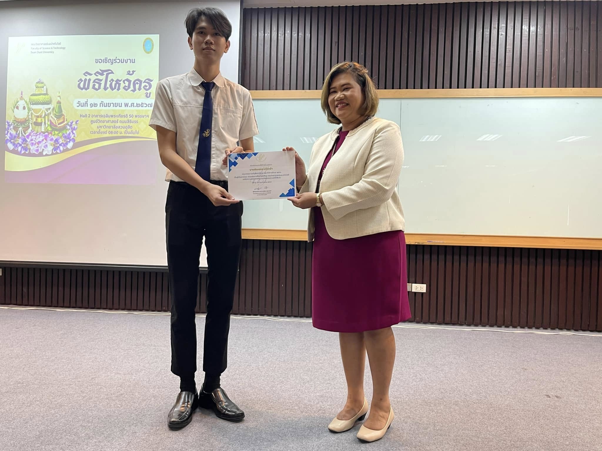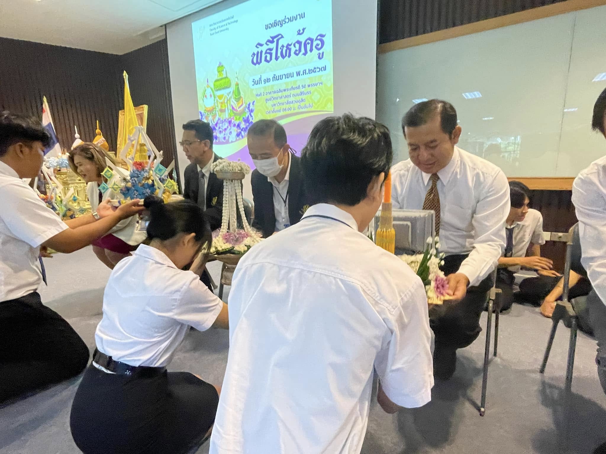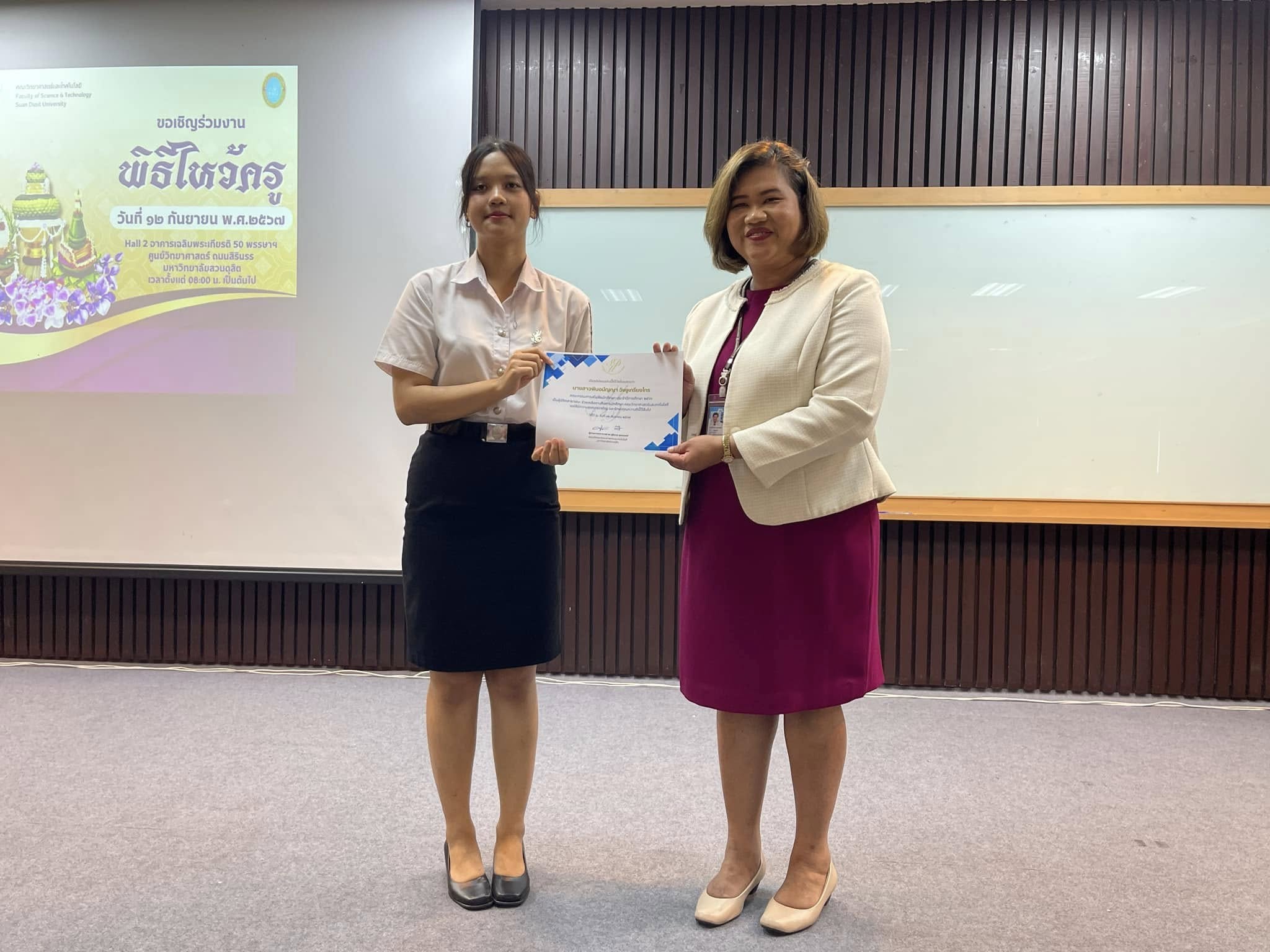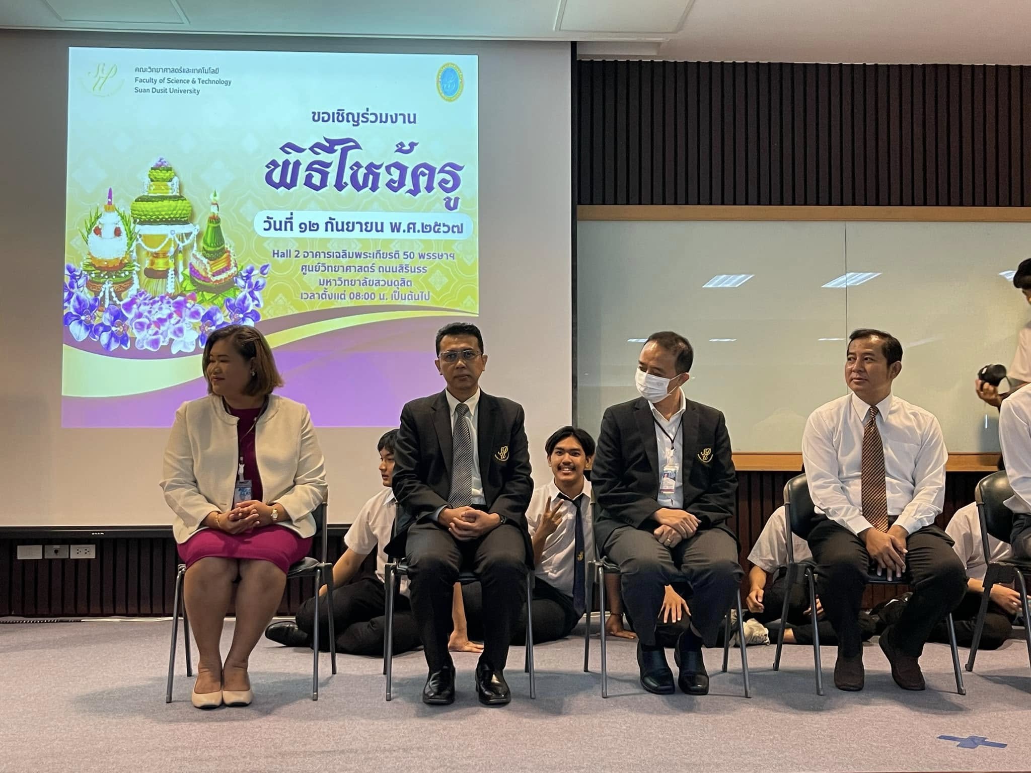 ผศ.ดร.ฐิตินาถ สุคนเขตร์ คณบดีคณะวิทยาศาสตร์และเทคโนโลยี เป็นประธานจุดธูปเทียนบูชาพระรัตนตรัย จากนั้นตัวแทนนักศึกษากล่าวนำสวดมนต์ไหว้พระ/กล่าวบทนำไหว้ครู ตัวแทนนักศึกษานำพานธูปเทียน และพานดอกไม้ไหว้ครู ตัวแทนนักศึกษานำกล่าวบทกลอนเทิดทูนพระคุณครู จากนั้นนักศึกษาร่วมร้องเพลงพระคุณที่สาม ตัวแทนนักศึกษานำกล่าวคำปฏิญาณตน คณบดีคณะวิทยาศาสตร์และเทคโนโลยี เจิมหนังสือ พร้อมกล่าวให้โอวาท ภายในงานยังได้รับเกียรติจากศิษย์เก่าดีเด่นที่มาบอกเล่าความรู้สึกที่มีต่อคณะวิทยาศาสตร์และเทคโนโลยี และมหาวิทยาลัยสวนดุสิต ปิดท้ายเป็นพิธีมอบเกียรติบัตรและประกาศยกย่องศิษย์เก่าดีเด่นของคณะวิทยาศาสตร์และเทคโนโลยี พิธีมอบเกียรติบัตรคณะกรรมการนักศึกษา ประจำปีการศึกษา 2567 พิธีประดับเข็มอะตอมนักศึกษาชั้นปีที่ 1 (สัญลักษณ์ประจำนักศึกษาคณะวิทยาศาสตร์และเทคโนโลยี)